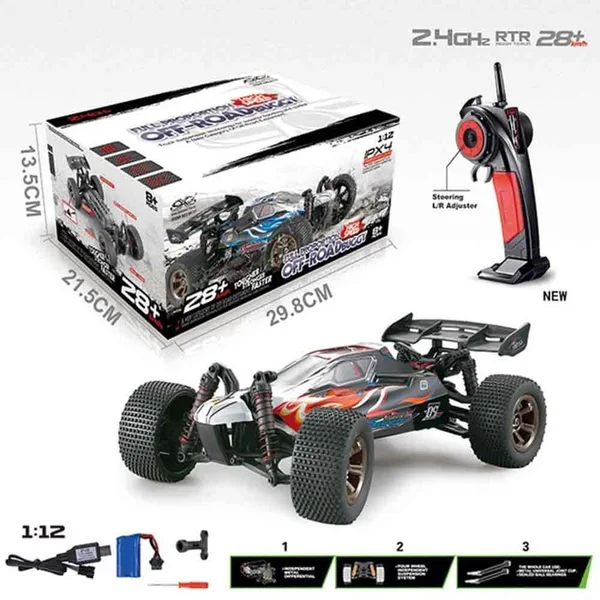 ریموت تفنگی نسل جدید که کنار محصول در تصاویر دیده میشود، طراحی ارگونومیک و خوشدستی دارد. برد آن حدود ۸۰ متر است که برای یک ماشین 1:12 مقدار بسیار قابل توجهی است و آزادی عمل فوقالعادهای در محیطهای باز ایجاد میکند. دقت فرمانپذیری بالاست و سرعت واکنش مدل، تجربهای بدون لگ و کاملاً روان میسازد.